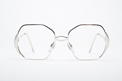 G/5 is a deadstock vintage metal frame with geometric shaped lenses, cutout details on the bridge, and adjustable nose pads.
